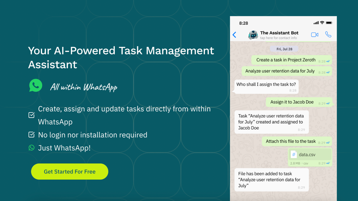 Just WhatsApp Assistant Bot! E.g: What are my tasks? What are Jane’s Project Zeroth tasks?Â