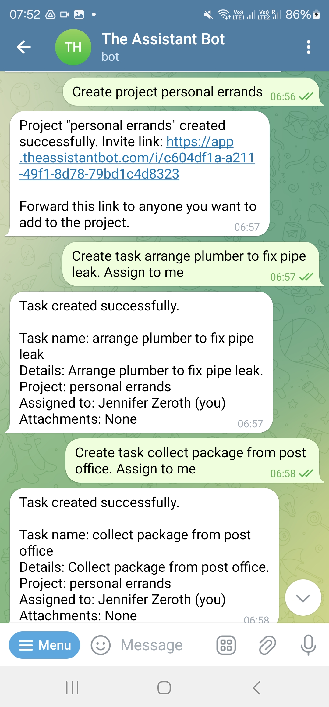 A family member (we will assume mama of the house, Jane Doe), texts Assistant Bot create projects like “personal errands”, “house chores” and “school”.